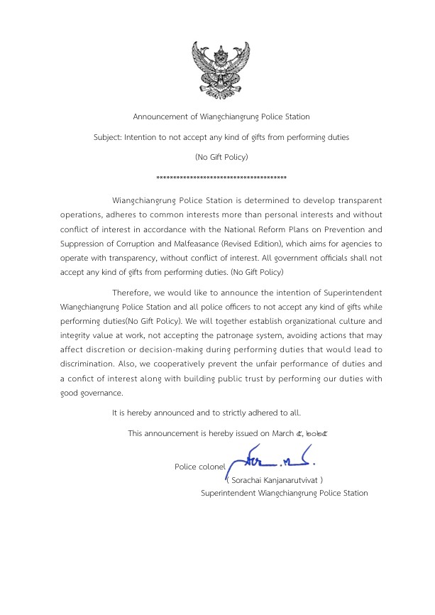 018. ประกาศนโยบายต่อต้านการรับสินบน (Anti-Bribery Policy)