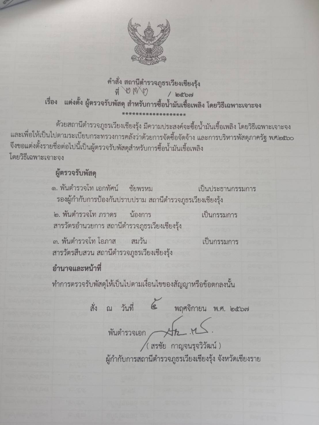 คำสั่งแต่งตั้ง ผู้ตรวจรับพัสดุ สำหรับการซื้อน้ำมันเชื้อเพลิง
